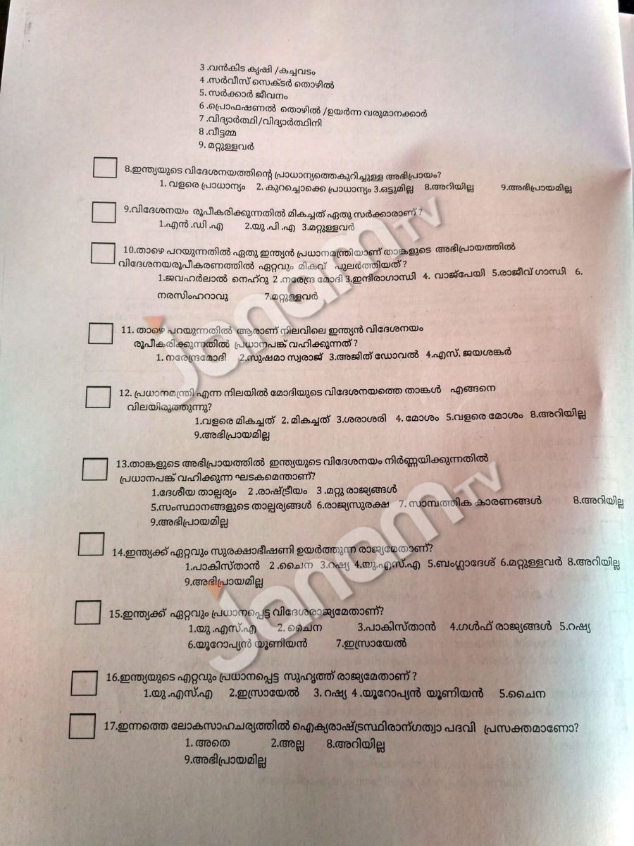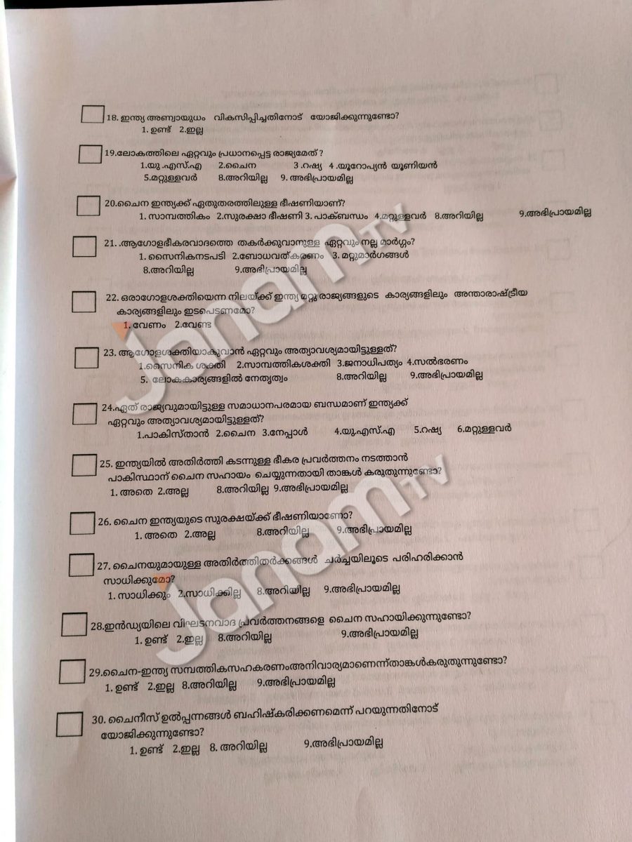ഇന്ത്യയുടെ വിദേശ നയത്തെക്കുറിച്ചുള്ള ചോദ്യങ്ങളിൽ നാലിലൊന്നും ചൈനയെ ലാക്കാക്കിയുള്ളതാണ് .ചൈന ഇന്ത്യയുടെ സുരക്ഷയ്ക്ക് ഭീഷണിയാണോ ? ചൈനീസ് ഉത്പന്നങ്ങൾ ബഹിഷ്കരിക്കണമെന്ന് പറയുന്നതിനോട് യോജിക്കുന്നുണ്ടോ ? ഇന്ത്യയിൽ അതിർത്തി കടന്നുള്ള ഭീകര പ്രവർത്തനങ്ങൾ നടത്താൻ ചൈന പാകിസ്ഥാന് സഹായം ചെയ്യുന്നെന്ന് നിങ്ങൾ കരുതുന്നുണ്ടോ ? ഇന്ത്യയിലെ വിഘടനവാദ പ്രവർത്തനങ്ങളെ ചൈന സഹായിക്കുന്നുണ്ടോ ? തുടങ്ങിയവയാണ് ചോദ്യങ്ങൾ.