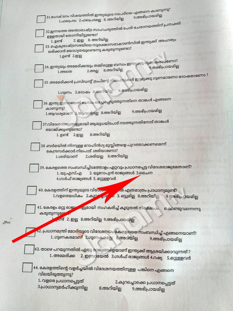 ഒപ്പം കേരളത്തെ സംബന്ധിച്ചിടത്തോളം എറ്റവും പ്രധാനപ്പെട്ട വിദേശ രാജ്യം ഏതാണെന്ന ചോദ്യവും ഉൾപ്പെടുത്തിയിട്ടുണ്ട് . ഇത് ചൈനീസ് അനുകൂല സർവേയാണെന്ന് ചോദ്യങ്ങൾ കാണുന്ന ഏതൊരാൾക്കും മനസിലാകും . വിവരങ്ങൾ രഹസ്യമായി സൂക്ഷിക്കുമെന്ന് പറയുന്നുണ്ടെങ്കിലും വേണമെങ്കിൽ തിരിമറി നടത്താനും കേരളീയർ ചൈനയെ അംഗീകരിക്കുന്നുവെന്ന് പ്രഖ്യാപിക്കാനും സിപിഎമ്മിനു കഴിയുന്ന രീതിയിലാണ് സർവേ നടപ്പിലാക്കുന്നത്.