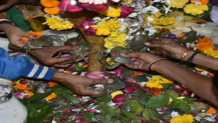 കേള്ക്കുമ്പോള് തന്നെ അതിശയവും അപൂര്വ്വവുമായി തോന്നുമെങ്കിലും ഇത് രാംനാഥ് ശിവ്ഖേലാ ക്ഷേത്രത്തിലെ വ്യത്യസ്തമായ ഒരു ആചാരം തന്നെയാണ്. എല്ലാ വര്ഷവും മകരസംക്രാന്തി നാളില് നടത്തുന്ന വിശേഷാല് പൂജയിലാണ് ഭക്തര് ഭഗവാന് നേര്ച്ചയ്ക്കായി ജീവനുള്ള ഞണ്ടുകളെയുമായി ക്ഷേത്രത്തില് എത്തുന്നത്. കുടുംബത്തില് ഐശ്വര്യവും സമൃദ്ധിയും രോഗമുക്തിയും ലഭിക്കുന്നതിനായി രാജ്യത്തിന്റെ വിവിധ ഭാഗങ്ങളില് നിന്നുമുള്ള ആളുകള് ജീവനുള്ള ഞണ്ടുകളെയുമായി ഇവിടെ എത്തുന്നു. നിരവധി ഐതിഹ്യങ്ങളും വിശ്വാസങ്ങളും ക്ഷേത്രത്തോട് അനുബന്ധിച്ച് നിലനില്ക്കുന്നുണ്ട്.