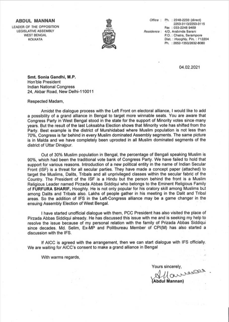 പശ്ചിമ ബംഗാളിൽ മതമൗലികവാദി സംഘടനകളുമായി അവിശുദ്ധ കൂട്ടുകെട്ടാണ് കോൺഗ്രസ്സും ഇടതുപക്ഷവും ഭരണകക്ഷിയായ തൃണമൂലും നടത്തുന്നത്. ബി.ജെ.പി നിരന്തരം ഉന്നയിക്കുന്ന ഈ ആരോപണത്തെ ന്യായീകരിക്കുന്ന കത്താണ് പുറത്തുവിടുന്നതെന്ന് ബി.ജെ.പി ദേശീയ ഐ.ടി ചുമതലയുള്ള അമിത് മാളവ്യ പറഞ്ഞു. ഇന്നലെ മന്നാൻ സോണിയയ്ക്ക് അയച്ച കത്താണ് അമിത് മാളവ്യ സമൂഹമാദ്ധ്യമങ്ങളിലൂടെ പരസ്യമാക്കിയത്.