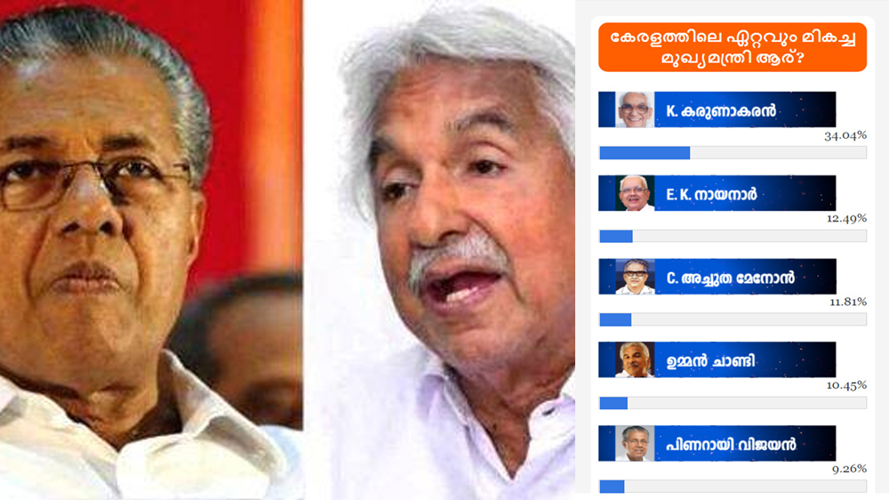കേരള ചരിത്രത്തിലെ ഏറ്റവും മികച്ച മുഖ്യമന്ത്രിയെ കണ്ടെത്താനുള്ള ഓൺലൈൻ പോളിൽ ഒന്നാം സ്ഥാനത്ത് കരുണാകരൻ തുടരുമ്പോൾ അഞ്ചാം സ്ഥാനത്തിനായി പിണറായിയും ഉമ്മൻ ചാണ്ടിയും തമ്മിൽ ഇഞ്ചോടിഞ്ച് പോരാട്ടം. 10.43 ശതമാനം വോട്ടുകളുമായി ഉമ്മൻ ചാണ്ടിയും 9.23 ശതമാനം വോട്ടുകളുമായി പിണറായി വിജയനും അഞ്ചും ആറും സ്ഥാനത്താണുള്ളത്.