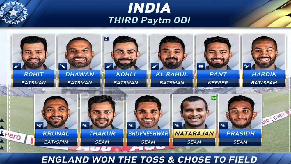 പൂനെ: അവസാന ഏകദിന മത്സരത്തിൽ ടോസ് നേടിയ ഇംഗ്ലണ്ട് ഇന്ത്യയെ ബാറ്റിംഗിനയച്ചു. ബാറ്റിംഗ് നിരയിൽ മാറ്റം വരുത്താത്ത ഇന്ത്യ സ്പിന്നർ കുൽദീപിന് പകരമായി പേസ് ബൗളർ ടി.നടരാജനെ ടീമിലുൾപ്പെടുത്തി. ബാറ്റിംഗ് നിരയിൽ ഋഷഭ് പന്ത് നിർണ്ണായ മത്സരത്തിൽ വീണ്ടും ടീമിലിടം നേടി.