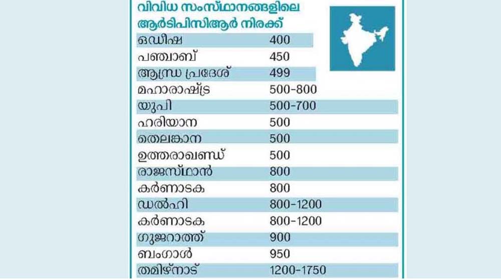 ന്യൂഡൽഹി ∙ ആർടിപിസിആർ പരിശോധനയ്ക്കു രാജ്യത്ത് ഏറ്റവും ഉയർന്ന നിരക്ക് ഈടാക്കുന്നത് കേരളത്തിലാണെന്ന് റിപ്പോർട്ട്. 1700 രൂപയാണ് കേരളത്തിൽ ആർടിപിസിആർ പരിശോധനയ്ക്ക് നിലവിൽ ഈടാക്കുന്നത്.