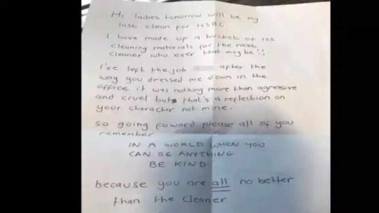 വ്യത്യസ്തമായ നിരവധി സംഭവങ്ങള് സമൂഹ മാദ്ധ്യമങ്ങളില് ചര്ച്ചയാകാറുണ്ട്. അത്തരത്തില് മുപ്പത്തിയഞ്ച് വര്ഷമായി ശുചീകരണ തൊഴിലാളിയായി ജോലി ചെയ്ത ഒരു സ്ത്രീയുടെ കത്താണ് ഇപ്പോള് ശ്രദ്ധ നേടുന്നത്. ഒടുവില് ജോലി ചെയ്തത് എച്ച്എസ്ബിസി ബാങ്കിന്റെ ശാഖയില് ശുചീകരണ തൊഴിലാളിയായി. എന്നാല് പേര് വെളിപ്പെടുത്താത്ത ഈ തൊഴിലാളിയുടെ ബോസ് ഒരു ക്രൂരനായ മേലധികാരിയാണ്. ഏതായാലും താന് ജോലിയില് നിന്നും വിരമിക്കുന്ന ദിവസം ബോസ്സിനൊരു മാസ്സ് കത്തെഴുതിയാണ് കക്ഷി ഇത്രയും കാലത്തെ ദേഷ്യം തീര്ത്തത്.