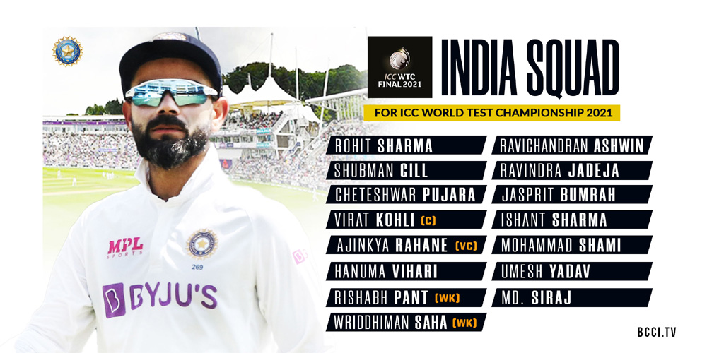 ടെസ്റ്റ് ചാമ്പ്യൻഷിപ്പിന് മുന്നോടിയായി ടീമംഗങ്ങൾ തമ്മിൽ നടന്ന മത്സരത്തിൽ രവീന്ദ്ര ജഡേജ, ഋഷഭ് പന്ത്, ഇഷാന്ത് ശർമ്മ, മുഹമ്മദ് സിറാജ് എന്നിവർ മികച്ച പ്രകടനമാണ് നടത്തിയത്. ജഡേജ 74 പന്തിൽ 54 റൺസും മൂന്ന് വിക്കറ്റുകളും നേടി. ബാറ്റിംഗിൽ ഉജ്ജ്വല ഫോമിലുള്ള ഋഷഭ് പന്ത് 94 പന്തിൽ 121 റൺസ് നേടി. ബാറ്റിംഗിൽ മധ്യനിരയിൽ തിളങ്ങാറുള്ള ഹനുമാ വിഹാരിയും ബൗളർ ഉമേഷ് യാദവും ടീമിലുണ്ട്. ഈ മാസം 18-ാം തിയതി വെള്ളിയാഴ്ചയാണ് മത്സരം ആരംഭിക്കുന്നത്.