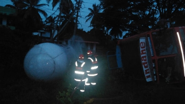 കാസർകോഡ് നീലേശ്വരം കരുവാച്ചേരി ദേശീയ പാതയിൽ ഗ്യാസ് ടാങ്കർ മറിഞ്ഞു
