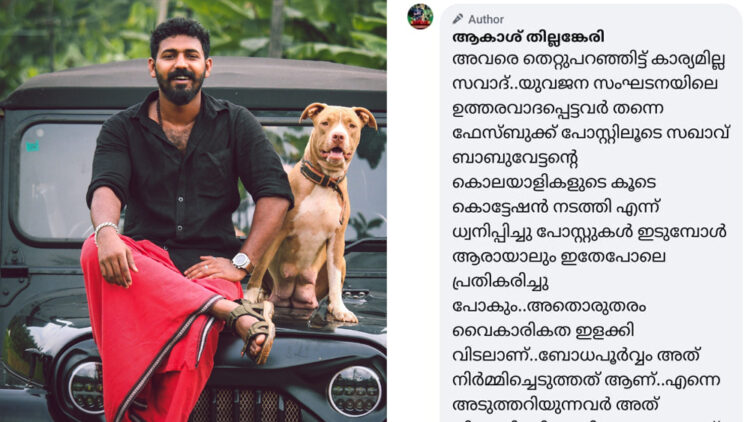 കുറ്റപ്പെടുത്തുന്നവരെ തെറ്റുപറയാനാവില്ല, ഉത്തരവാദപ്പെട്ടവർ തന്നെ ഫെയ്സ്ബുക്ക് പോസ്റ്റിലൂടെ ബാബുവേട്ടന്റെ കൊലയാളികളുടെ കൂടെ ക്വട്ടേഷൻ നടത്തി എന്ന് പോസ്റ്റുകൾ ഇടുമ്പോൾ ആരായാലും ഇതുപോലെ പ്രതികരിച്ചുപോവും. ഇത് ഒരു തരം വൈകാരികത ഇളക്കിവിടലാണ്. ഡി.വൈ.എഫ്.ഐ ജില്ലാ സെക്രട്ടറി ആവുമ്പോൾ പറയുന്നതിൽ ആധികാരികതയുണ്ടെന്ന് ധരിച്ചുപോവും. രക്തസാക്ഷികളെ ഒറ്റിക്കൊടുത്തവർ ആരായാലും അവരുടെ പേര് വെളിപ്പെടുത്തണം. താനാണ് കുറ്റവാളിയെങ്കിൽ തെരുവിൽ വന്ന് നിൽക്കാം. നിങ്ങൾക്കെന്നെ എറിഞ്ഞുകൊല്ലാവുന്നതാണ്. അല്ലാതെ സംശയത്തിന്റെ നിഴലിൽ നിർത്തുന്നത് അംഗീകരിക്കാനാവില്ലെന്നും ആകാശ് തില്ലങ്കേരി കുറിച്ചു.