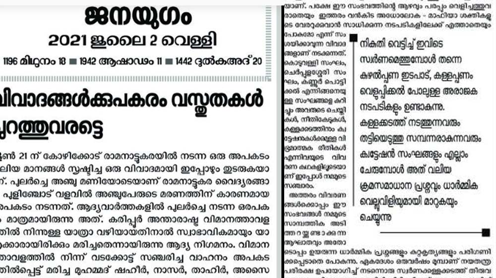 ആദ്യം വാഹനാപകടമെന്ന നിലയിൽ പുറത്തുവന്ന വാർത്ത പിന്നീട് വലിയ ദുരൂഹതകളിലേക്കാണ് വിരൽ ചൂണ്ടിയതെന്ന് മുഖപത്രം സ്പഷ്ടമായി പറയുന്നു. വിധ്വംസക — അധോലോക — മാഫിയാ ബന്ധങ്ങളുള്ളതും ചുരുളഴിയുന്ന അപസർപ്പക കഥകളിലേയ്ക്കും വഴിമാറി. സ്വർണക്കള്ളക്കടത്ത്, അങ്ങനെ കൊണ്ടുവരുന്ന സ്വർണം തട്ടിയെടുക്കൽ, അതിനുവേണ്ടിയുള്ള ക്വട്ടേഷൻ പ്രവർത്തനം എന്നിങ്ങനെ കണ്ണികളും ചങ്ങലകളും നീളുന്ന സംഭവങ്ങളാണ് ഇപ്പോൾ വെളിപ്പെടുത്തലുകളും മൊഴികളുമായി പുറത്തുവന്നുകൊണ്ടിരിക്കുന്നത്. അറസ്റ്റ് ചെയ്യപ്പെട്ടവർക്ക് രാഷ്ട്രീയമോ അല്ലാത്തതോ ആയതും പാടില്ലാത്തതും ധാർമ്മികതയ്ക്കു യോജിക്കാത്തതുമായ ബന്ധങ്ങൾ ഉണ്ടെങ്കിൽ അവ പുറത്തുവരേണ്ടതുതന്നെയാണ്. പക്ഷേ ഈ സംഭവത്തിന്റെ ആഴവും പരപ്പും വെളിച്ചത്തുവരാതെയും ഇത്തരം വൻകിട അധോലോക — മാഫിയാ ശക്തികളുടെ വേരറുക്കുവാൻ സാധിക്കുന്ന നടപടികളിലേക്ക് എത്താതെയും പോകുമോ എന്ന് സംശയിക്കാവുന്ന വിവാദങ്ങളാണ് നടക്കുന്നതെന്നും മുഖപത്രം വിമർശിക്കുന്നു.