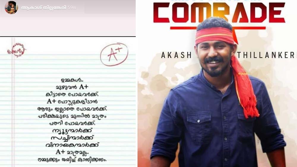 മുഴുവൻ എ പ്ലസും കിട്ടാതെ പോയവരെയും എ പ്ലസ് പോസ്റ്റുകളിടാൻ ആരും ഇല്ലാതെ പോയവരെയും പരീക്ഷയുടെ മുൻപിൽ മാത്രം പതറിപ്പോയവരെയും ആശ്വസിപ്പിക്കുന്ന പോസ്റ്ററാണ് ആകാശ് സ്റ്റാറ്റസാക്കി ഷെയർ ചെയ്തത്. എ പ്ലസ് മാത്രമല്ല നമുക്കും ജയിച്ച് കാണിക്കണം എന്ന വാക്കുകളോടെയാണ് പോസ്റ്റ് അവസാനിക്കുന്നത്.
