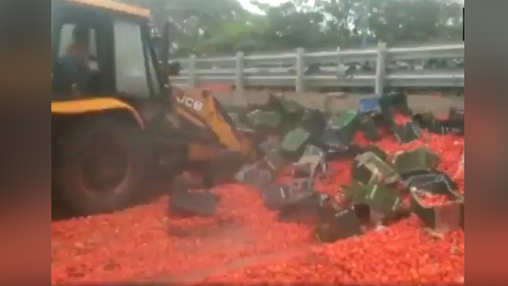 20 ടൺ തക്കാളി കയറ്റിവന്ന ട്രക്കാണ് മറിഞ്ഞത്. തക്കാളി മുഴുവൻ റോഡിൽ ചിതറിയിരുന്നു. മണ്ണുമാന്തി യന്ത്രം ഉപയോഗിച്ച് റോഡിലെ തക്കാളികളെല്ലാം നീക്കിയ ശേഷമാണ് ഗതാഗതം പുനരാരംഭിച്ചത്. ഒരുമണിക്കൂറോളം നേരം നീണ്ട പ്രവർത്തനത്തിനൊടുവിലാണ് തക്കാളികൾ നീക്കം ചെയ്തത്.