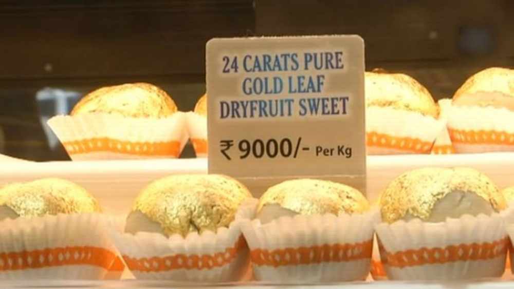 ‘ഗോള്‍ഡ് സ്വീറ്റ്സ്’ എന്നറിയപ്പെടുന്ന ഈ പലഹാരത്തിന് ഉത്സവ സീസണ്‍ അടുക്കുന്തോറും വില കുതിച്ചുയരുകയാണ്. ഈ കടയില്‍ സ്വര്‍ണ്ണപ്പണികളോട് കൂടിയ മധുരപലഹാരങ്ങളും വില്‍ക്കുന്നുണ്ട്. ഈ പലഹാരങ്ങളുടെ വില പക്ഷെ ഞെട്ടിക്കുന്നതാണ്. ഒരു കിലോ സ്വര്‍ണ മധുരപലഹാരങ്ങളുടെ വില ഒമ്പതിനായിരം രൂപയാണ്. സ്വര്‍ണ്ണ ഫോയില്‍ കൊണ്ട് പൂശിയ ഈ മധുരപലഹാരങ്ങളും കാജു കത്രിയും ആരോഗ്യത്തിന് വളരെ നല്ലതാണെന്നാണ് കടയുടമയുടെ വിശ്വാസം.
