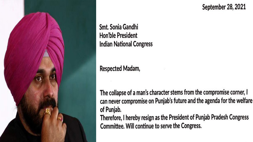 ഛണ്ഡിഗഡ്:പഞ്ചാബ് കോൺഗ്രസ് അദ്ധ്യക്ഷ സ്ഥാനത്ത് നിന്നും നവജ്യോത് സിംഗ് സിദ്ധു രാജി വച്ചു. രാജി കത്ത് കോൺഗ്രസ് അദ്ധ്യക്ഷ സോണിയാ ഗാന്ധിക്ക് കൈമാറി. പഞ്ചാബിന്റെ ഭാവിയുടെ കാര്യത്തിൽ വിട്ടുവീഴ്ച ചെയ്യാനാകില്ലെന്നും വ്യക്തിത്വം പണയപ്പെടുത്തി ഒത്തുതീർപ്പുകൾക്ക് തയ്യാറാകില്ലെന്നും രാജി കത്തിൽ സിദ്ദു പറയുന്നു.