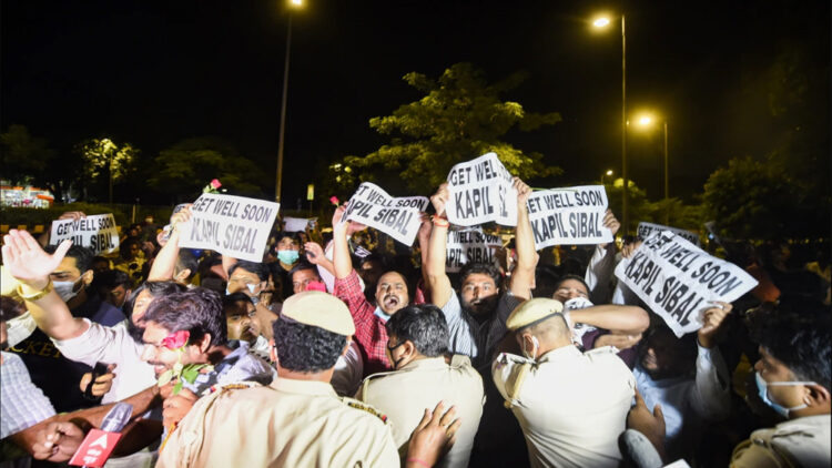 പഞ്ചാബ് കോൺഗ്രസിൽ പ്രതിസന്ധി രൂക്ഷമായതിന് പിന്നാലെയാണ് നേതൃത്വത്തിനെതിരെ കപിൽ സിബൽ രൂക്ഷവിമർശനം ഉന്നയിച്ചത്. പാർട്ടിക്ക് ഇപ്പോൾ പ്രസിഡന്റ് ഇല്ലെന്നും ആരാണ് തീരുമാനങ്ങൾ എടുക്കുന്നത് എന്ന് അറിയില്ലെന്നും കപിൽ സിബൽ ആരോപിച്ചിരുന്നു. ഇതിന് പിന്നാലെയായിരുന്നു കപിൽ സിബലിന്റെ വസതിക്ക് മുന്നിലെ പ്രതിഷേധം. ‘സിബൽ എത്രയും വേഗം സുഖം പ്രാപിക്കുക’ എന്നെഴുതിയ പ്ലക്കാർഡുകളുമായി നൂറ് കണക്കിന് യൂത്ത് കോൺഗ്രസ് പ്രവർത്തകരാണ് ഇവിടെ സംഘടിച്ചെത്തിയത്. ഇതിന് പുറമെ പ്രവർത്തകർ അദ്ദേഹത്തിന്റെ വീടിന് നേരെ തക്കാളിയേറും നടത്തി.