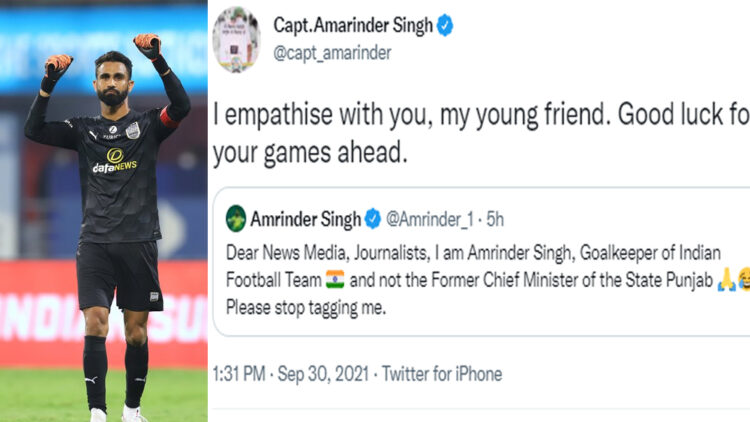 പ്രിയപ്പെട്ട മാധ്യങ്ങളെ, മാധ്യമപ്രവർത്തകരേ. ഞാൻ അംരീന്ദർ സിങ്, ഇന്ത്യൻ ഫുട്‌ബോൾ ടീമിന്റെ ഗോൾകീപ്പർ, പഞ്ചാബ് മുൻ മുഖ്യമന്ത്രിയല്ല. ദയവായി എന്നെ ടാഗ് ചെയ്യുന്നത് നിർത്തുക എന്നാണ് അദ്ദേഹത്തിന്റെ ട്വീറ്റ്.