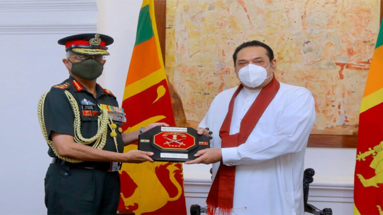 ‘ജനറൽ എം.എം.നരവാനേ ഇന്ന് ശ്രീലങ്കൻ പ്രധാനമന്ത്രിയുടെ ആതിഥ്യം സ്വീകരിച്ചു. മഹിന്ദ രജപക്സെ ഇന്ത്യയുമായുള്ള സുദീർഘമായ നയതന്ത്ര ബന്ധങ്ങൾ കൂടുതൽ ശക്തമാക്ക ണമെന്ന ആഗ്രഹമാണ് പങ്കുവെച്ചത്. പ്രതിരോധ രംഗത്ത് കൂടുതൽ കാര്യങ്ങൾ ഇരുരാജ്യങ്ങൾക്കും നിർവ്വഹിക്കാനുണ്ടെന്നും രജപക്സെ പറഞ്ഞു.’ കേന്ദ്ര പ്രതിരോധ മന്ത്രാലയം ട്വീറ്റ് ചെയ്തു.