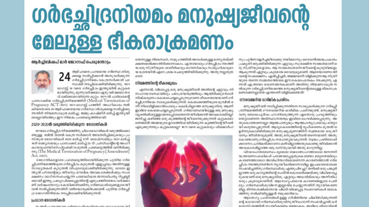 24 ആഴ്ച്ചവരെ പ്രായമായ ഗർഭസ്ഥ ശിശുക്കളെ ഗർഭച്ഛിദ്രം നടത്താൻ അനുവദിക്കുന്ന നിയമം കേന്ദ്രസർക്കാർ പാസാക്കിയ പശ്ചാത്തലത്തിലാണ് ലേഖനം. ജനിച്ച കുഞ്ഞിന്റെ ജീവൻ എടുക്കുന്നത് കുറ്റമാണ്. എങ്കിൽ അമ്മയുടെ ഉദരത്തിൽവെച്ച് ജീവൻ എടുക്കുന്നതും കുറ്റമല്ലേ. ശാരീരിക ദൗർബല്യങ്ങളുടെ പേരിൽ ഗർഭച്ഛിദ്രത്തെ ന്യായീകരിക്കാനാവില്ലെന്നും ലേഖനത്തിൽ ചൂണ്ടിക്കാട്ടുന്നു.