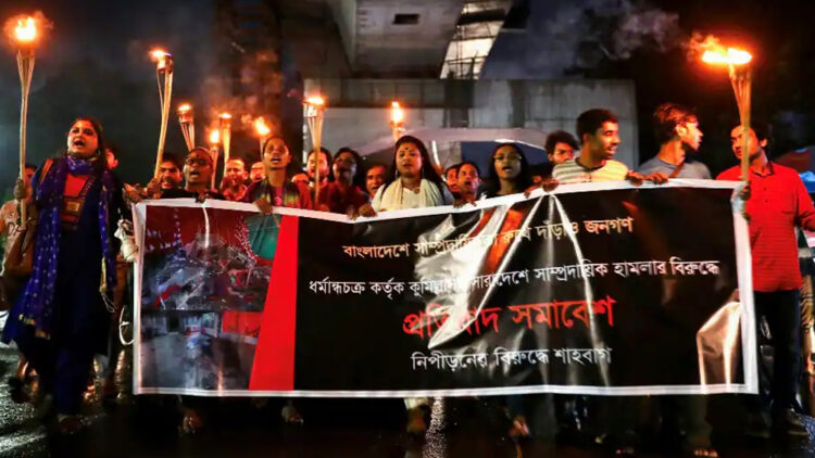 ആക്രമണം അഴിച്ചുവിട്ടവർക്കെതിരെ ശക്തമായ നടപടിയെടുക്കണമെന്ന് ആവശ്യപ്പെട്ടായിരുന്നു പ്രതിഷേധം. പോസ്റ്ററുകൾ, ബാനറുകൾ, പന്തങ്ങൾ എന്നിവ കയ്യിലേന്തി ധാക്ക സർവ്വകലാശാലയ്ക്ക് മുൻപിലായിരുന്നു പ്രതിഷേധക്കാർ സംഘടിച്ചത്. നൂറിലധികം ഹിന്ദുക്കൾ പ്രതിഷേധ പ്രകടനത്തിൽ പങ്കെടുത്തു. രാജ്യത്ത് ന്യൂനപക്ഷങ്ങൾക്ക് സുരക്ഷ ഒരുക്കണമെന്നും ഹിന്ദുക്കൾ ആവശ്യപ്പെട്ടു.