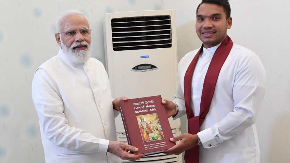 ന്യൂഡൽഹി: കുശിനഗർ അന്താരാഷ്ട്ര വിമാനത്താവളത്തിന്റെ ഉദ്ഘാടനത്തിന് എത്തിയ ശ്രീലങ്കൻ കായിക മന്ത്രി നമൾ രജപക്സ ഇന്ത്യൻ പ്രധാനമന്ത്രി നരേന്ദ്ര മോദിക്ക് ഒരു അപൂർവ്വ സമ്മാനവുമായിട്ടാണ് എത്തിയത്. ഭഗവദ് ഗീതയുടെ സിംഹള പതിപ്പാണ് അദ്ദേഹം പ്രധാനമന്ത്രിക്ക് സമ്മാനിച്ചത്. സിംഹള ഭാഷയിലെ ഇംഗ്ലീഷ് പതിപ്പും തമിഴ് വിവർത്തനവും അടങ്ങിയ ഗ്രന്ഥമാണ് സമ്മാനിച്ചത്.