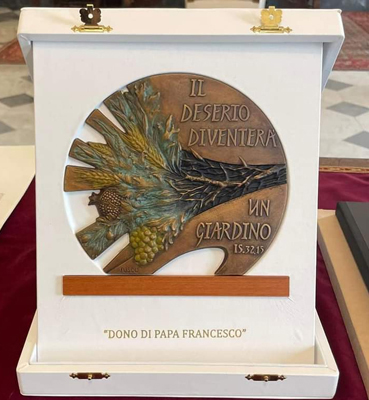 ഒലീവിന്റെ ചില്ല പതിച്ച ഒരു വെങ്കല ഫലകമാണ് മാർപാപ്പ പ്രധാനമന്ത്രിയ്‌ക്ക് നൽകിയത്. ഒലീവിലെ ബൈബിളിൽ പ്രതീക്ഷയുടെ അടിയാളമാണ്. ഒലീവിന്റെ ചില്ലയുള്ള ഫലകത്തിൽ ഏശയ്യാ പ്രവാചകന്റെ പുസ്തകത്തിലെ മരുഭൂമി ഫലപുഷ്ടിയുള്ളതാകും എന്ന വചനം ആലേഖനം ചെയ്തിട്ടുണ്ട്.
