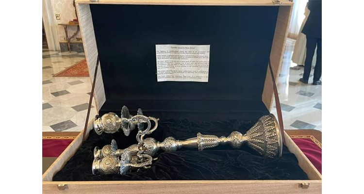 മാർപാപ്പയ്‌ക്ക് പ്രത്യേകം നിർമ്മിച്ച മെഴുകുതിരി കാലുകൾ സമ്മാനിച്ച് പ്രധാനമന്ത്രി: ഒലീവിന്റെ ഇലകൾ പതിച്ച ഫലകം മോദിയ്‌ക്ക് നൽകി മാർപാപ്പ