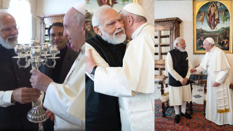 മാർപാപ്പയ്ക്ക് പ്രത്യേകം നിർമ്മിച്ച മെഴുകുതിരി കാലുകൾ സമ്മാനിച്ച് പ്രധാനമന്ത്രി: ഒലീവിന്റെ ഇലകൾ പതിച്ച ഫലകം മോദിയ്ക്ക് നൽകി മാർപാപ്പ