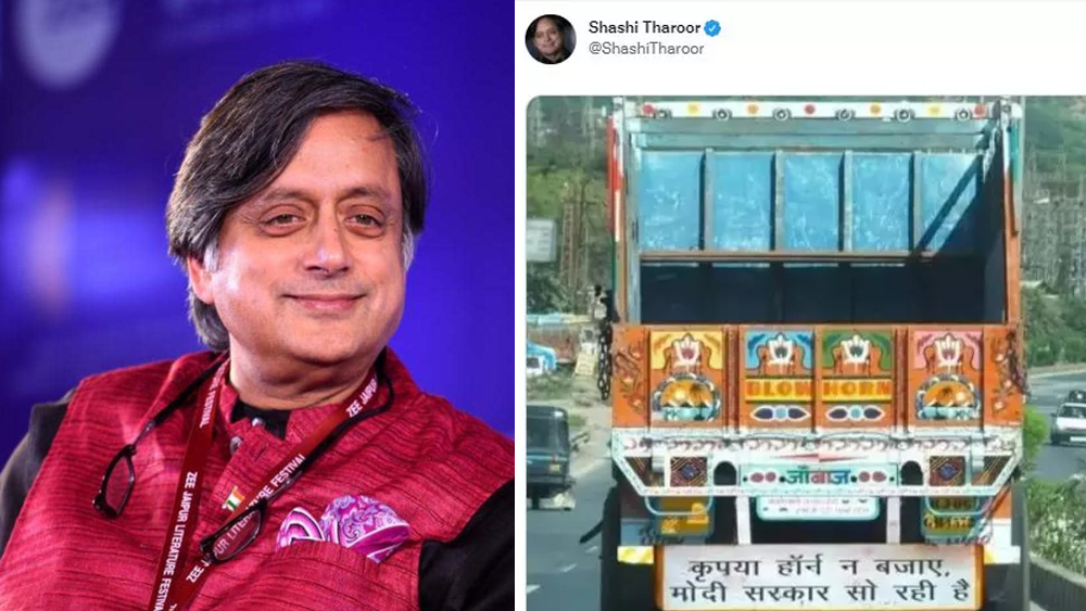 കഴിഞ്ഞ ദിവസമായിരുന്നു ശശി തരൂരിന്റെ ട്വീറ്റ്. നമ്പർപ്ലേറ്റിന്റെ ഭാഗത്ത് മോദിയ്ക്കെതിരെ ബോർഡുവെച്ചുകൊണ്ടുള്ള ലോറിയുടെ ചിത്രമായിരുന്നു എംപി പങ്കുവെച്ചത്. ഹോൺ മുഴക്കരുത്, മോദി ഉറങ്ങുകയാണെന്നായിരുന്നു ബോർഡിൽ എഴുതിയിരുന്നത്. മോദി സർക്കാരിനെ പരിഹസിച്ചുകൊണ്ടുള്ള തരൂരിന്റെ ട്വീറ്റ് നിമിഷങ്ങൾക്കുള്ളിൽ തന്നെ മറ്റ് കോൺഗ്രസ് പ്രവർത്തകരും അനുഭാവികളും ഏറ്റെടുത്തു.