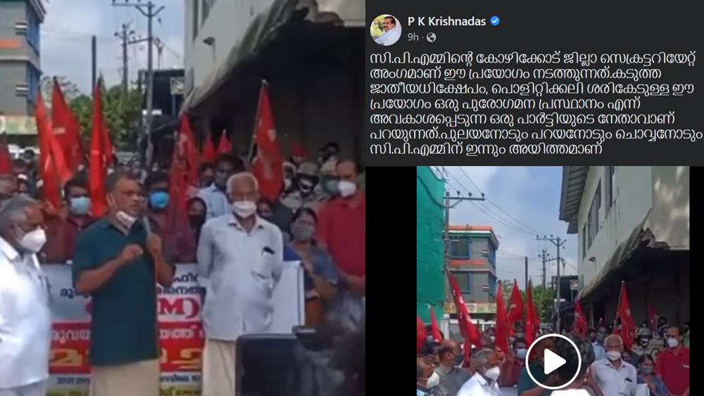 കടുത്ത ജാതീയധിക്ഷേപം, പൊളിറ്റിക്കലി ശരികേടുള്ള ഈ പ്രയോഗം ഒരു പുരോഗമന പ്രസ്ഥാനം എന്ന് അവകാശപ്പെടുന്ന ഒരു പാർട്ടിയുടെ നേതാവാണ് പറയുന്നതെന്ന കാര്യവും അദ്ദേഹം ഫേസ്ബുക്ക് പോസ്റ്റിൽ ചൂണ്ടിക്കാട്ടി.