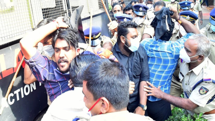 മുഖ്യമന്ത്രിയുടെ പ്രൈവറ്റ് സെക്രട്ടറി കെ.കെ രാഗേഷിന്റെ ഭാര്യ പ്രിയ വർഗീസിനെ പിൻവാതിൽ നിയമനം നടത്തിയതിന്റെ പശ്ചാത്തലത്തിലാണ് പ്രതിഷേധം. സംഭവത്തിൽ സർവകലാശാല ചട്ടം കാറ്റിൽ പറത്തി വൈസ് ചാൻസലർ ഗോപിനാഥ് രവീന്ദ്രനെ സർക്കാർ പുനർനിയമനം നടത്തിയിരുന്നു. ഈ സാഹചര്യത്തിലാണ് യുവമോർച്ച പ്രവർത്തകർ പ്രതിഷേധവുമായി സർവകലാശാലയിലെത്തിയത്. ബിജെപി ജില്ലാ സെക്രട്ടറി അരുൺ കൈതപ്രം, യുവമോർച്ച ജില്ല ജനറൽ സെക്രട്ടറി അർജുൻ മാവിലക്കണ്ടി, കെ.രഞ്ജിത്ത്, ജില്ലാ സെക്രട്ടറി അർജ്ജുൻ കെ.വി, അക്ഷയ് കൃഷ്ണാ, അഭിറാം കെ എന്നിവരെ പോലീസ് അറസ്റ്റ് ചെയ്ത് നീക്കി.