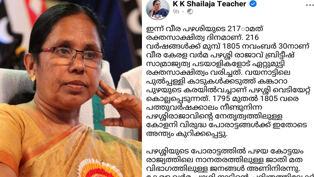 കൊച്ചി : വീരപഴശിയുടെ രക്തസാക്ഷി ദിനത്തിൽ ഫേസ്ബുക്ക് പോസ്റ്റിട്ട മുൻ മന്ത്രി കെ കെ ശൈലജയ്ക്ക് നേരെ ജിഹാദികളുടെ സൈബർ ആക്രമണം . വീര പഴശിയുടെ 217 -)0മത് രക്തസാക്ഷിത്വ ദിനത്തോടനുബന്ധിച്ചായിരുന്നു ഫേസ്ബുക്ക് പോസ്റ്റ് . 216 വര്ഷങ്ങള്ക്ക് മുമ്പ് 1805 നവംബര് 30നാണ് വീര കേരള വര്മ പഴശ്ശി രാജാവ് ബ്രിട്ടീഷ് സാമ്രാജ്യത്വ പടയാളികളോട് ഏറ്റുമുട്ടി രക്തസാക്ഷിത്വം വരിച്ചത്. വയനാട്ടിലെ പുല്പ്പള്ളി കാടുകള്ക്കടുത്ത് കങ്കാറാ പുഴയുടെ കരയില്വച്ചാണ് പഴശ്ശി വെടിയേറ്റ് കൊല്ലപ്പെടുന്നത് – കെ കെ ശൈലജ ഫേസ്ബുക്ക് പോസ്റ്റിൽ പറയുന്നു.