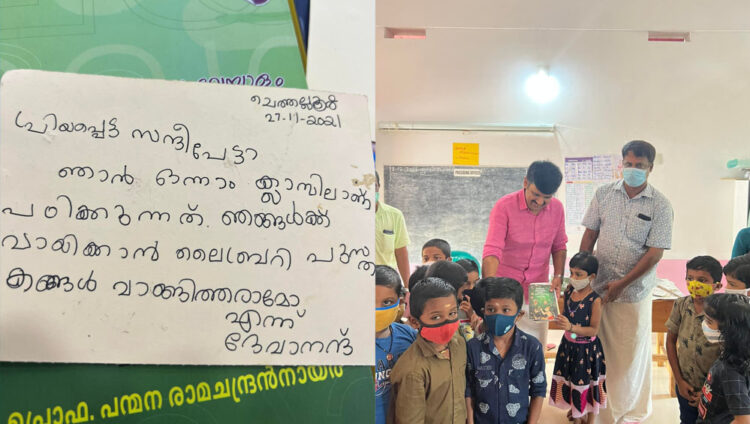 ഇക്കഴിഞ്ഞ ദിവസം സ്‌കൂളിലെ രണ്ടു വിദ്യാർത്ഥികൾ എഴുതിയ പോസ്റ്റ് കാർഡുകൾ ലഭിക്കുകയുണ്ടായി . ലൈബ്രറിയിലേക്ക് പുസ്‌തകങ്ങൾ നൽകാമോ എന്ന് ചോദിച്ചായിരുന്നു ആ കത്തുകൾ . സന്തോഷം തോന്നി . ഉടൻ ഡിസി ബുക്സിൽ പോയി കുറച്ചു ബാലസാഹിത്യ പുസ്‌തകങ്ങൾ വാങ്ങി . നിഷ്കളങ്കമായ ആ കത്തുകൾ ലഭിച്ച വിവരവും പുസ്‌തകങ്ങൾ വാങ്ങിയ വിവരവും ഓർമ്മകളുടെ ചരടുകൾ നഷ്ടപ്പെട്ടുകൊണ്ടിരിക്കുന്ന അമ്മയെയും ധരിപ്പിച്ചു . അമ്മക്ക് സന്തോഷായി . കുറെ കാലത്തിനു ശേഷം അമ്മയുടെ മുഖത്ത് ചിരി കണ്ടു . നല്ല കാര്യം എന്ന് പതിയെ പറഞ്ഞു . രാവിലെ സ്‌കൂൾ പ്രധാനാദ്ധ്യാപകൻ ഉണ്ണികൃഷ്ണൻ മാസ്റ്ററുടെയും ജയശ്രി ടീച്ചറുടെയും സാന്നിധ്യത്തിൽ കത്തെഴുതിയ കുട്ടികളുടെ കൈവശം ലൈബ്രറിയിലേക്കുള്ള പുസ്‌തകങ്ങൾ നൽകി . കുട്ടികൾ വായിച്ചു വളരട്ടെ – ഇത്തരത്തിലാണ് അദ്ദേഹത്തിന്റെ ഫേസ്ബുക്ക് പോസ്റ്റ് .