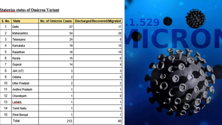 ന്യൂഡൽഹി: രാജ്യത്ത് ഒമിക്രോൺ ബാധിതരുടെ എണ്ണം കുതിച്ചുയരുന്നു. ഡൽഹിയിൽ 24 പേർക്ക് കൂടി രോഗം സ്ഥിരീകരിച്ചു. നിലവിൽ 213 പേർക്കാണ് രാജ്യത്ത് ഒമിക്രോൺ സ്ഥിരീകരിച്ചിരിക്കുന്നത്. ഇതിൽ 90 പേർ രോഗം ഭേദമായി ആശുപത്രി വിട്ടു. ഡൽഹിയിലാണ് ഏറ്റവും കൂടുതൽ രോഗികളുള്ളത്. 57 പേർ ഇവിടെ ചികിത്സയിൽ കഴിയുന്നുണ്ട്. രണ്ടാം സ്ഥാനത്ത് മഹാരാഷ്‌ട്രയാണുള്ളത്. 54 പേർക്കാണ് ഇവിടെ രോഗം സ്ഥിരീകരിച്ചത്. 15 രോഗികളോടെ കേരളം ആറാം സ്ഥാനത്താണ്.