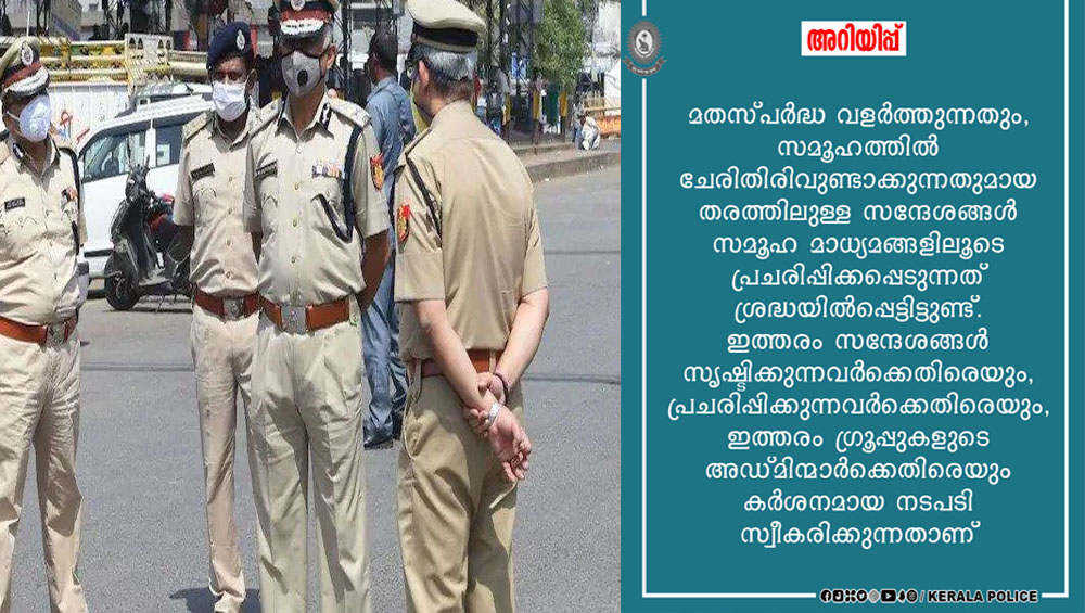 മതസ്പര്ദ്ധ വളര്ത്തുന്നതും സമൂഹത്തിൽ ചേരിതിരിവുണ്ടാക്കുന്നതുമായ സന്ദേശങ്ങൾ സമൂഹമാദ്ധ്യമങ്ങളിലൂടെ പ്രചരിപ്പിക്കപ്പെടുന്നത് ശ്രദ്ധയിൽപ്പെട്ടിട്ടുണ്ട് . ഇത്തരം സന്ദേശങ്ങൾ സൃഷ്ടിക്കുന്നവർക്കെതിരെയും,പ്രചരിപ്പിക്കുന്നവർക്കെതിരെയും ,ഇത്തരം ഗ്രൂപ്പുകളുടെ അഡ്മിന്മാർക്കെതിരെയും കർശന നടപടി സ്വീകരിക്കുമെന്നാണ് പോലീസിന്റെ ഫേസ്ബുക്ക് പോസ്റ്റ്.