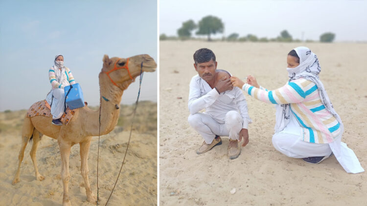 രാജസ്ഥാനിലെ മരുഭൂമിയിൽ ഒട്ടകപ്പുറത്തെത്തി വാക്‌സിൻ കുത്തിവെച്ച് ആരോഗ്യപ്രവർത്തക: ചിത്രം പങ്കുവെച്ച് കേന്ദ്ര ആരോഗ്യമന്ത്രി