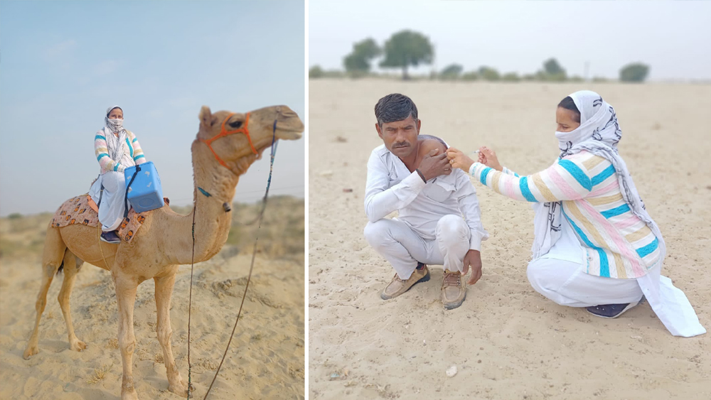 രാജസ്ഥാനിലെ മരുഭൂമിയിൽ ഒട്ടകപ്പുറത്തെത്തി വാക്‌സിൻ കുത്തിവെച്ച് ആരോഗ്യപ്രവർത്തക: ചിത്രം പങ്കുവെച്ച് കേന്ദ്ര ആരോഗ്യമന്ത്രി