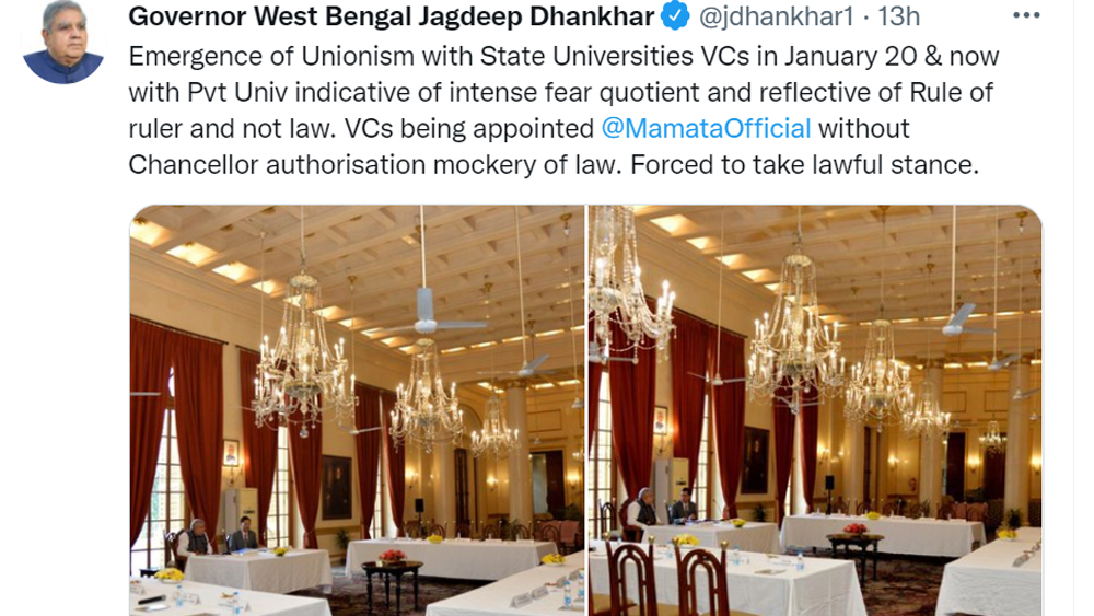 സംസ്ഥാനത്തെ സ്വകാര്യ സർവ്വകലാശാല വൈസ് ചാൻസലർമാരുടെ യോഗം ഗവർണർ വിളിച്ചുവെങ്കിലും ആരും പങ്കെടുക്കാൻ തയ്യാറായിരുന്നില്ല. വൈസ് ചാൻസലർമാരുടെ യൂണിയനിസം ഞെട്ടിക്കുന്നതാണെന്ന് ഗവർണർ ജഗ്ദീപ് ധൻകർ പിന്നീട് ട്വീറ്റ് ചെയ്യുകയും ചെയ്തിരുന്നു. രാജ്ഭവനിലെ യോഗഹാളിൽ ഒഴിഞ്ഞുകിടക്കുന്ന കസേരകളുടെ ചിത്രങ്ങളും അദ്ദേഹം പങ്കുവെച്ചിരുന്നു.