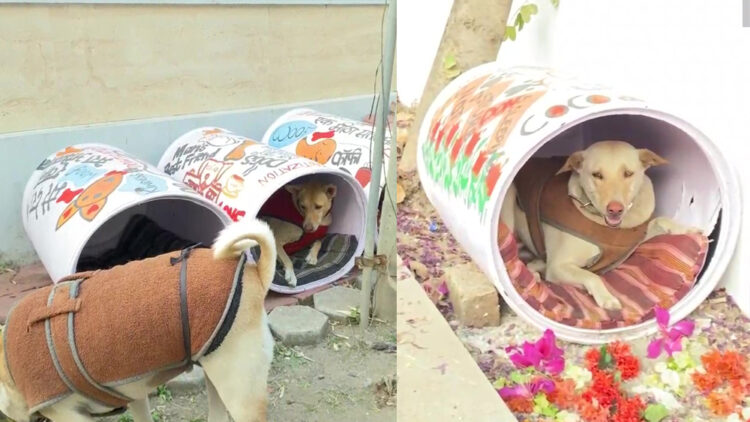 ഭോപ്പാൽ: തണുപ്പിൽ നിന്നും രക്ഷനേടാൻ പുതപ്പ് ചൂടി നടക്കുന്ന അസമിലെ ആനക്കുട്ടികളുടെ ചിത്രങ്ങൾ സമൂഹമാദ്ധ്യമങ്ങളിൽ വൈറലായിരുന്നു. ഇപ്പോഴിതാ അത്തരത്തിലുള്ള ഒരു ചിത്രമാണ് മദ്ധ്യപ്രദേശിലെ ഇൻഡോറിൽ നിന്നും പുറത്തുവരുന്നത്. ശൈത്യത്തിൽ നിന്നും രക്ഷനേടാൻ കമ്പിളി പുതച്ചു നിൽക്കുന്ന നായകളാണ് ചിത്രത്തിലുള്ളത്. തണുപ്പിൽ നിന്നും മൃഗങ്ങളേയും രക്ഷിക്കുന്നതിന്റെ ഭാഗമായി പ്രദേശവാസികൾ ആരംഭിച്ച പുതിയ പദ്ധതിയാണിത്.