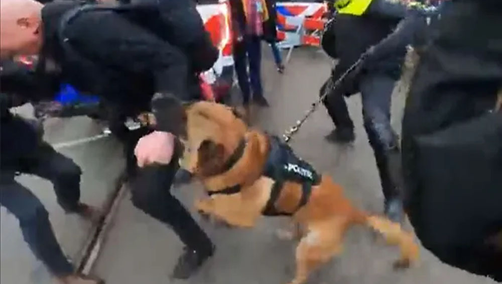 നായയെ പിടിച്ചു മാറ്റാൻ പോലീസുകാർ ശ്രമിക്കുന്നുണ്ടായിരുന്നു . കയ്യിലുണ്ടായിരുന്ന ബാറ്റൺ ഉപയോഗിച്ച് നായയെ അവർ അടിക്കുന്നുണ്ടെങ്കിലും പ്രതിഷേധക്കാരനെ വിട്ടയക്കാൻ നായ തയ്യാറായില്ല . പോലീസും സമരക്കാരും തമ്മിലുണ്ടായ വാക്കേറ്റത്തിനു പിന്നാലെ 30 പേരെ കസ്റ്റഡിയിലെടുത്തതായി റിപ്പോർട്ടുകൾ ഉണ്ട്. നാല് ഉദ്യോഗസ്ഥർക്കും പരിക്കേറ്റു.