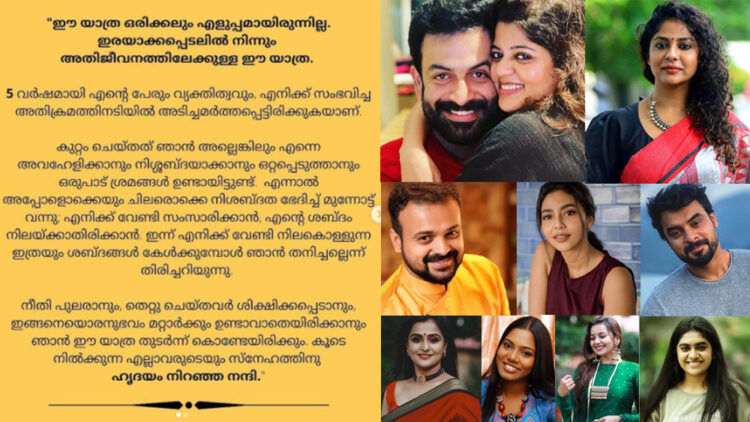 ഇരയിൽ നിന്നും അതിജീവനത്തിലേക്കുള്ള അഞ്ച് വർഷത്തെ യാത്രയിൽ തന്റെ പേരും വ്യക്തിത്വവും അടിച്ചമർത്തപ്പെട്ടുവെന്നാണ് നടി പറയുന്നത്. എങ്കിലും ചിലരൊക്കെ നിശബ്ദത ഭേദിച്ച് മുന്നോട്ട് വന്നു. നീതിയ്ക്ക് വേണ്ടിയുള്ള പോരാട്ടം ഇനിയും തുടരും. കൂടെ നിന്ന എല്ലാവർക്കും നന്ദി പറഞ്ഞുകൊണ്ടാണ് കുറിപ്പ് അവസാനിക്കുന്നത്.