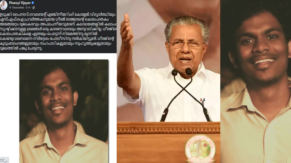 ഇടുക്കി പൈനാവ് ഗവണ്മെൻ്റ് എഞ്ചിനീയറിംഗ് കോളേജ് വിദ്യാർത്ഥിയും എസ്.എഫ്.ഐ പ്രവർത്തകനുമായ ധീരജ് രാജേന്ദ്രന്റെ കൊലപാതകം അങ്ങേയറ്റം ദുഃഖകരവും അപലപനീയവുമാണ്. കലാലയങ്ങളിൽ കലാപം സൃഷ്ടിക്കാനുള്ള ശ്രമങ്ങൾ ഒരു കാരണവശാലും അനുവദിക്കില്ല. ധീരജിന്റെ കൊലപാതകികളെ എത്രയും പെട്ടെന്ന് നിയമത്തിനു മുന്നിൽ കൊണ്ടുവരണമെന്ന നിർദ്ദേശം പോലീസിനു നൽകിയിട്ടുണ്ട്. ധീരജിന്റെ കുടുംബാംഗങ്ങളുടേയും സഹപാഠികളുടേയും സുഹൃത്തുക്കളുടേയും ദുഃഖത്തിൽ പങ്കു ചേരുന്നു.