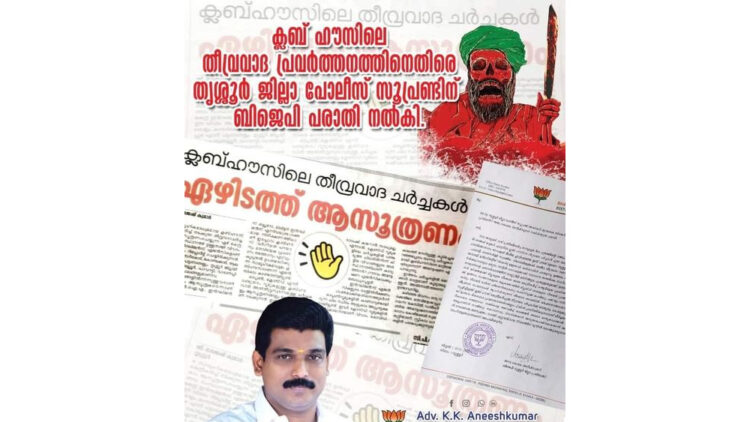 തൃശ്ശൂർ: സോഷ്യൽ മീഡിയ പ്ലാറ്റ്ഫോമായ ക്ലബ് ഹൗസിൽ തൃശ്ശൂർ ജില്ലയിലെ കൊടുങ്ങല്ലൂർ, പാവറട്ടി, വാടാനപ്പിള്ളി തുടങ്ങിയ സ്ഥലങ്ങളിലുള്ളവർ അതീവ തീവ്രവാദ സ്വഭാവമുള്ള ചർച്ചകൾ നടത്തുന്നതായി ഇൻറലിജന്റ്സ് റിപ്പോർട്ട്. ഇക്കാര്യം ചൂണ്ടിക്കാട്ടി ഒരു പത്രത്തിൽ വാർത്ത വന്നിരുന്നു. സംഭവത്തിൽ അന്വേഷണം നടത്തി കുറ്റവാളികളെ അറസ്റ്റ് ചെയ്യണമെന്നാവശ്യപ്പെട്ട് ബിജെപി ജില്ലാ പ്രസിഡൻറ് അഡ്വ കെ.കെ അനീഷ്കുമാർ തൃശ്ശൂർ ജില്ലാ പോലീസ് സൂപ്രണ്ടിന് പരാതി നൽകി.