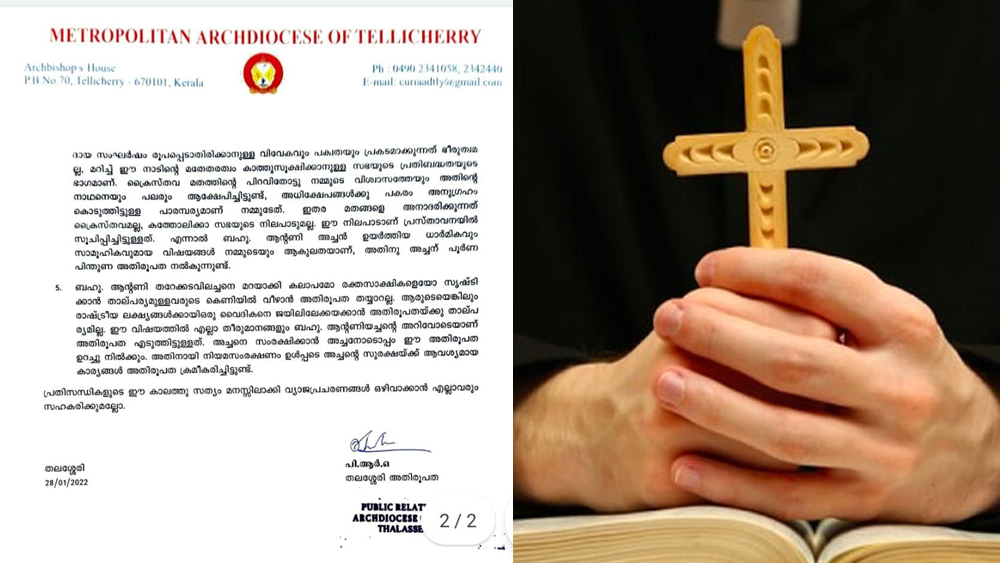 ആന്റണി തെക്കേതറയിലിനെയോ അദ്ദേഹത്തിന്റെ പ്രസ്താവനയേയോ തള്ളിക്കളയാൻ തയ്യാറല്ലെന്ന് അതിരൂപത അറിയിച്ചു. രാജ്യത്തിന്റെ നിയമവ്യവസ്ഥിതിയെ വെല്ലുവിളിച്ച് സഭയ്‌ക്ക് പ്രവർത്തിക്കാനാകില്ലെന്നും അതിരൂപത പുറത്തുവിട്ട പ്രസ്താവനയിൽ പറയുന്നു. മണിക്കടവ് സെന്റ് തോമസ് പള്ളിയിലെ പെരുന്നാൾ പ്രഭാഷണത്തിനിടെയായിരുന്നു കേസിനാസ്പദമായ സംഭവം.