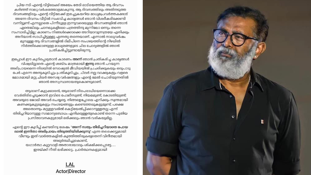 ആ ദിവസങ്ങളിൽ ദിലീപിനെ സംശയത്തിന്റെ നിഴലിൽ നിർത്തിക്കൊണ്ടുളള മാദ്ധ്യമങ്ങളുടെ ചില ചോദ്യങ്ങൾക്ക് താൻ പ്രതികരിച്ചിരുന്നു. അന്ന് താൻ പറഞ്ഞ കാര്യങ്ങൾ വിഷ്വൽ ഒഴിവാക്കി ശബ്ദം മാത്രമായി ഇന്നത്തെ അഭിപ്രായമെന്ന തരത്തിൽ സോഷ്യൽ മീഡിയയിൽ പ്രചരിക്കുകയാണ്. ഒരുപാട് പേർ ഇതിനെ അനുകൂലിച്ചും പ്രതികൂലിച്ചും അഭിപ്രായ പ്രകടനം നടത്തുകയും തന്റെ മേൽ അസഭ്യവർഷം ചൊരിയുകയും ചെയ്യുന്നുണ്ട്. അതിൽ താൻ അസ്വസ്ഥനായതുകൊണ്ടാണ് ഇപ്പോൾ ഈ കുറിപ്പ് എഴുതുന്നതെന്നും ഫേസ്ബുക്കിലൂടെ നൽകിയ വിശദീകരണത്തിൽ ലാൽ പറഞ്ഞു.