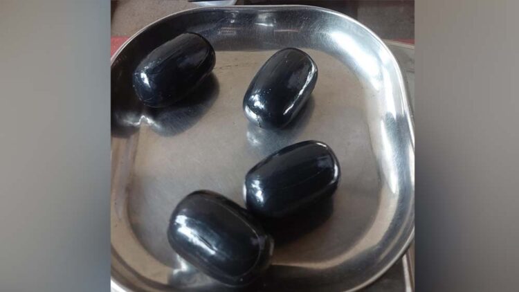 സ്വർണ്ണ മിശ്രിതം മൂന്ന് ക്യാപ്സൂൾ രൂപത്തിലാക്കി ശരീരത്തിൽ ഒളിപ്പിച്ചാണ് അനധികൃതമായി കടത്തുവാൻ ശ്രമിച്ചത്. ഷാർജയിൽ നിന്നും എയർ അറേബ്യ വിമാനത്തിൽ കുടുംബസമേതം എത്തിയ ചെറുതുരുത്തി സ്വദേശിയായ യാത്രക്കാരനിന്ന് 570 ഗ്രാം സ്വർണ്ണമാണ് എയർ കസ്റ്റംസ് ഇന്റലിജൻസ് വിഭാഗം പിടികൂടിയത്. സ്വർണ്ണമാലകൾ ധരിച്ച് വസ്ത്രം കൊണ്ട് ഒളിപ്പിച്ചായിരുന്നു നീക്കം. ഇരുവരേയും കസ്റ്റഡിയിൽ എടുത്ത് ചോദ്യം ചെയ്ത് വരികയാണ്.