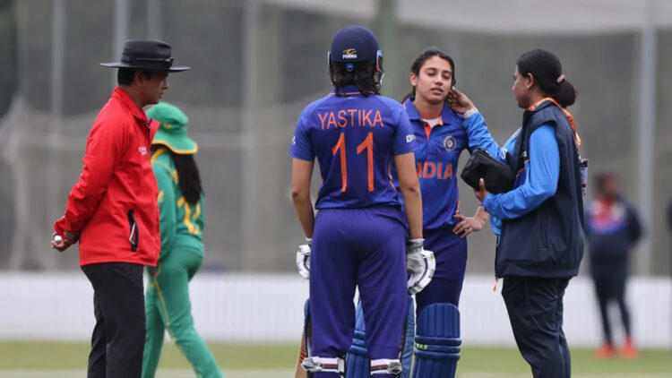 ദക്ഷിണാഫ്രിക്കൻ ഫാസ്റ്റ് ബൗളർ ഷബ്‌നീം ഇസ്മയിലിന്റെ ബൗൺസർ ഹെൽമറ്റിൽ കൊണ്ടാണ് മന്ദാനയ്‌ക്ക് പരിക്കേറ്റത്. വൈദ്യ പരിശോധനയ്‌ക്ക് ശേഷമാണ് മന്ദാന ഇന്നിങ്‌സ് പൂർത്തിയാക്കാതെ മടങ്ങിയത്. താരത്തിന് മറ്റ് പ്രശ്‌നങ്ങളില്ലെന്നും മുൻകരുതൽ എന്ന നിലയിലാണ് മടങ്ങിയതെന്നും അധികൃതർ അറിയിച്ചു.