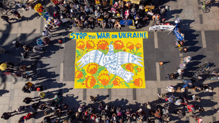 മരിയയുടെ ചിറകു വിടർത്തിയ പ്രാവിന്റെ പടുകൂറ്റൻ ചിത്രങ്ങൾ പ്രദർശിപ്പിച്ച് യുദ്ധത്തിനെതിരെയുള്ള പ്രതിഷേധപരിപാടികളും ലോകത്തിന്റെ പലഭാഗങ്ങളിലും നടക്കുന്നുണ്ട്. ഇന്നലെ സാൻഫ്രാൻസിസ്കോയിൽ നടന്ന ഒരു പ്രതിഷധ പരിപാടിയിൽ മരിയയുടെ ചിത്രം 100 ലധികം കലാകാരന്മാർ പുനസൃഷ്ടിക്കുകയുണ്ടായിരുന്നു. നിറഞ്ഞ കൈയ്യടികളോടയാണ് ജനങ്ങൾ തങ്ങളുടെ പ്രതീക്ഷയുടെ പ്രതീകത്തെ വരവേറ്റത്.