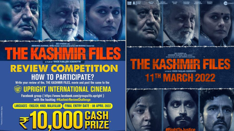 വിവക് അഗ്നിഹോത്രി സംവിധാനം ചെയ്ത ഏറ്റവും പുതിയ ചിത്രം ദ കശ്മീർ ഫയൽ കഴിഞ്ഞ ദിവസമാണ് തീയേറ്ററുകളിൽ എത്തിയത്. കശ്മീരി പണ്ഡിറ്റുകളുടെ പലായനമാണ് ചിത്രത്തിൽ പറയുന്നത്. യഥാർത്ഥ സംഭവങ്ങളെ അടിസ്ഥാനമാക്കിയാണ് ചിത്രം ഒരുക്കിയിരിക്കുന്നത്. കേരളത്തിൽ ആദ്യം വളരെ കുറച്ച് തീയേറ്ററിൽ മാത്രമെ ചിത്രത്തിന് പ്രദർശനം ഉണ്ടായിരുന്നുള്ളൂ. ഇപ്പോൾ കേരളത്തിൽ മാത്രം നിരവധി ഷോകളാണ് ചിത്രത്തിന് വേണ്ടിയുള്ളത്. ഇപ്പോഴിതാ ചിത്രം കാണുന്നവർക്കായി ഒരു ഫിലിം റിവ്യൂ മത്സരവുമായി എത്തിയിരിക്കുകയാണ് അപ്പ് റൈറ്റ് ഇന്റർനാഷണൽ സിനിമ എന്ന ഫേസ്ബുക്ക് സിനിമ ഗ്രൂപ്പ്.