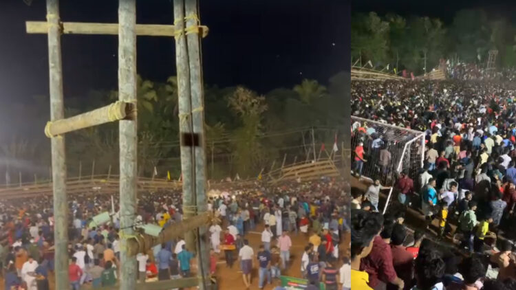 എട്ടരയോടെയായിരുന്നു സംഭവം. കമ്പും മുളയും കൊണ്ട് കെട്ടിയുണ്ടാക്കിയ ഗാലറിയാണ് തകർന്നത്.  ടൂർണമെന്റ് നടക്കുന്നതിനിടെയാണ് ഗ്യാലറി തകർന്ന് വീണത്. കളി തുടങ്ങുന്നതിന് തൊട്ട് മുൻപാണ് അപകടം ഉണ്ടായത്. ഫൈനൽ മത്സരമായിരുന്നു ആരംഭിക്കാനിരുന്നത്.