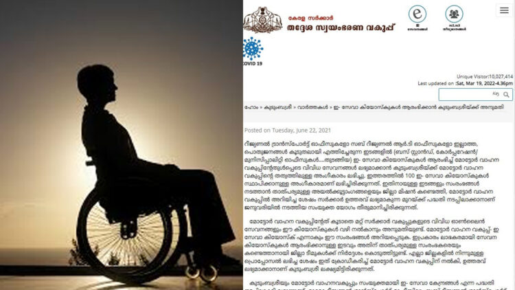 ഭിന്നശേഷി സൗഹൃദ സംസ്ഥാനമെന്ന് അവകാശപ്പെടുന്ന സർക്കാരിന്റെ സുപ്രധാന പ്രഖ്യാപനമായിരുന്നു ഇ-കിയോസ്ക് കേന്ദ്രങ്ങൾ സ്ഥാപിക്കുമെന്നത്. ഭിന്നശേഷിക്കാർക്കായി മോട്ടോർ വാഹന വകുപ്പിന്റെ സേവന കേന്ദ്രങ്ങളായി പ്രവർത്തിക്കുന്നതാണ് ഇ-കിയോസ്ക് കേന്ദ്രങ്ങൾ.