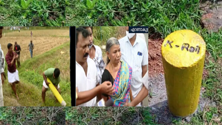 എറണാകുളം: സംസ്ഥാനത്ത് കെ റെയിലിനെതിരെ പ്രതിഷേധം കനക്കുന്നു. ചോറ്റാനിക്കരയിലെത്തിയ കെ-റെയിൽ ഉദ്യോഗസ്ഥരെ നാട്ടുകാർ തടഞ്ഞു. ഉദ്യോഗസ്ഥർ സ്ഥാപിച്ച സർവ്വെ കല്ലുകൾ നാട്ടുകാർ പിഴുതെറിഞ്ഞു. ഇതോടെ വയലിൽ കല്ലിടാനാകാതെ ഉദ്യോഗസ്ഥർ മടങ്ങേണ്ട അവസ്ഥയാണ്. ചോറ്റാനിക്കര കിടങ്ങയത്ത് സ്ഥിതിചെയ്യുന്ന പാടശേഖരത്തിലാണ് കെ-റെയിൽ ഉദ്യോഗസ്ഥർ കല്ലിടാനെത്തിയത്.
