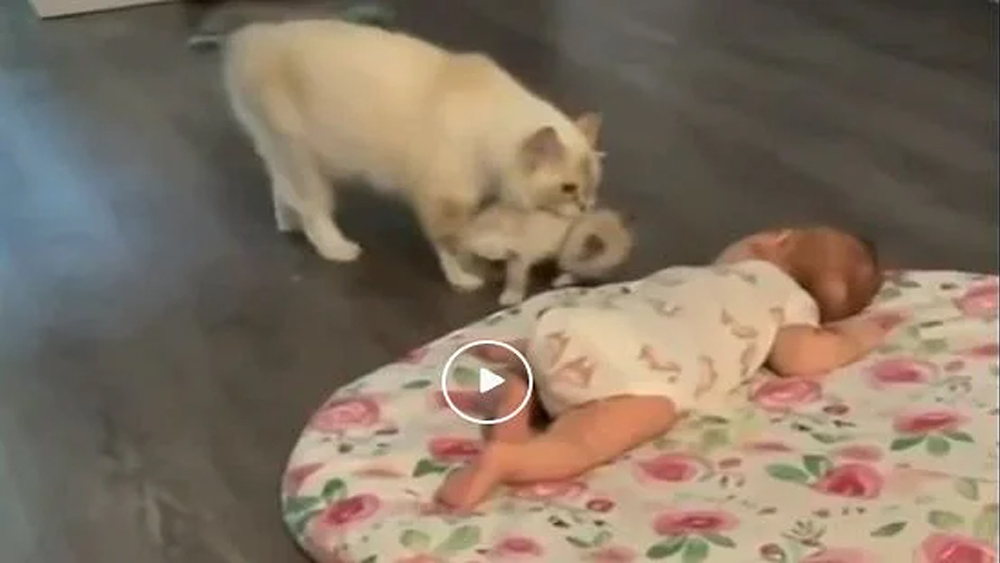 ഏതാനും മാസങ്ങൾ മാത്രം പ്രായം തോന്നിക്കുന്ന കുഞ്ഞിനെ നിലത്ത് ബെഡിൽ കിടത്തിയിരിക്കുകയാണ്. കിടന്ന് കളിച്ചുകൊണ്ടിരിക്കുന്ന കുഞ്ഞിന്റെ അരികിലേക്ക് അമ്മ പൂച്ച നടന്നുവന്നു. പൂച്ചകുഞ്ഞിനെ വായിൽ കടിച്ചുപിടിച്ചാണ് അമ്മപൂച്ചയുടെ വരവ്. ഒടുവിൽ നിലത്ത് കിടന്ന് കളിക്കുകയായിരുന്ന നവജാത ശിശുവിന്റെ പക്കൽ പൂച്ചകുഞ്ഞിനെ കിടത്തി.